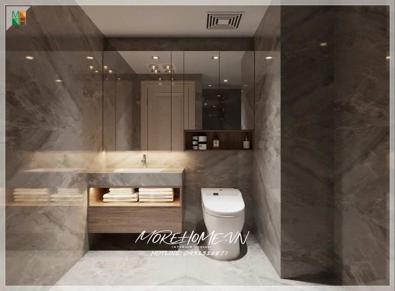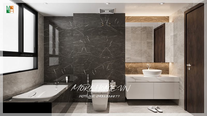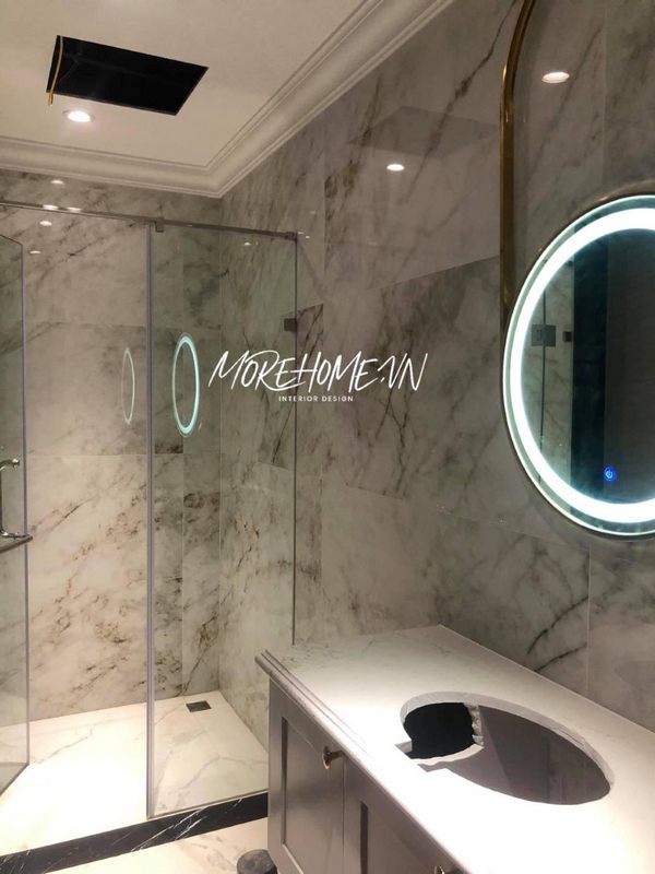 Sự sang trọng của không gian phòng tắm còn thể hiện ở đá lát sàn và ốp tường vân mây rất đẳng cấp.