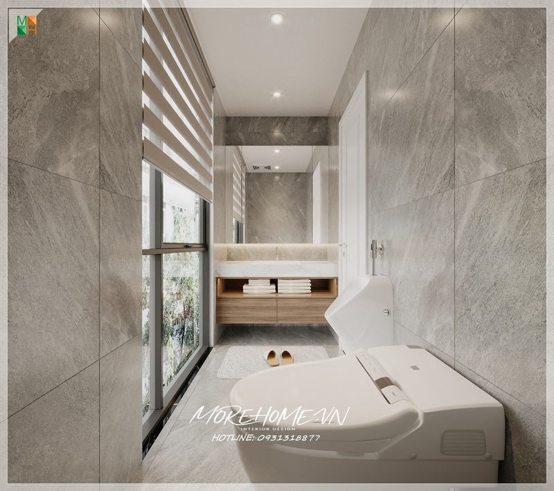 Mặt đá ốp tường cũng được lựa chọn cùng màu với gạch lát nền tạo nên giao diện đồng đều chặt chẽ phù hợp để đạt được hiệu quả cao cho phòng tắm.